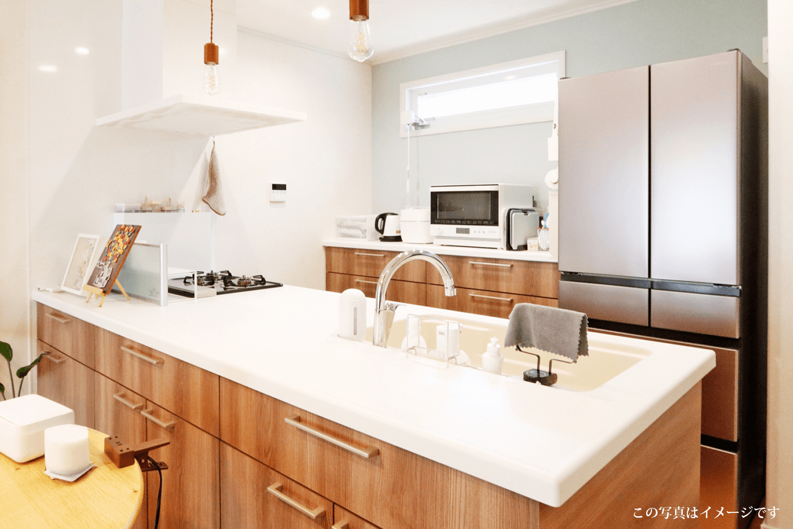 ・自然な風合いが広がる空間に、大容量カップボードで安心の収納力。美しさと使いやすさを両立♪