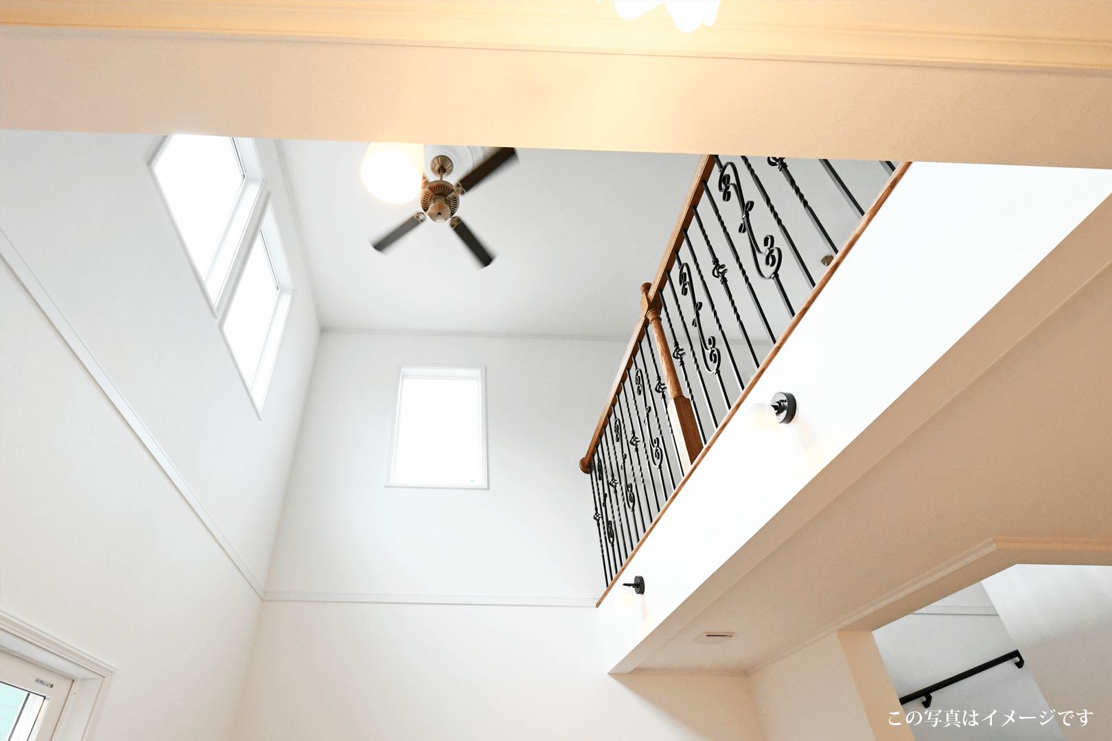・デザイン性のあるアイアンの輸入装飾手摺とシーリングファンが、海外の住宅のような雰囲気をつくります。