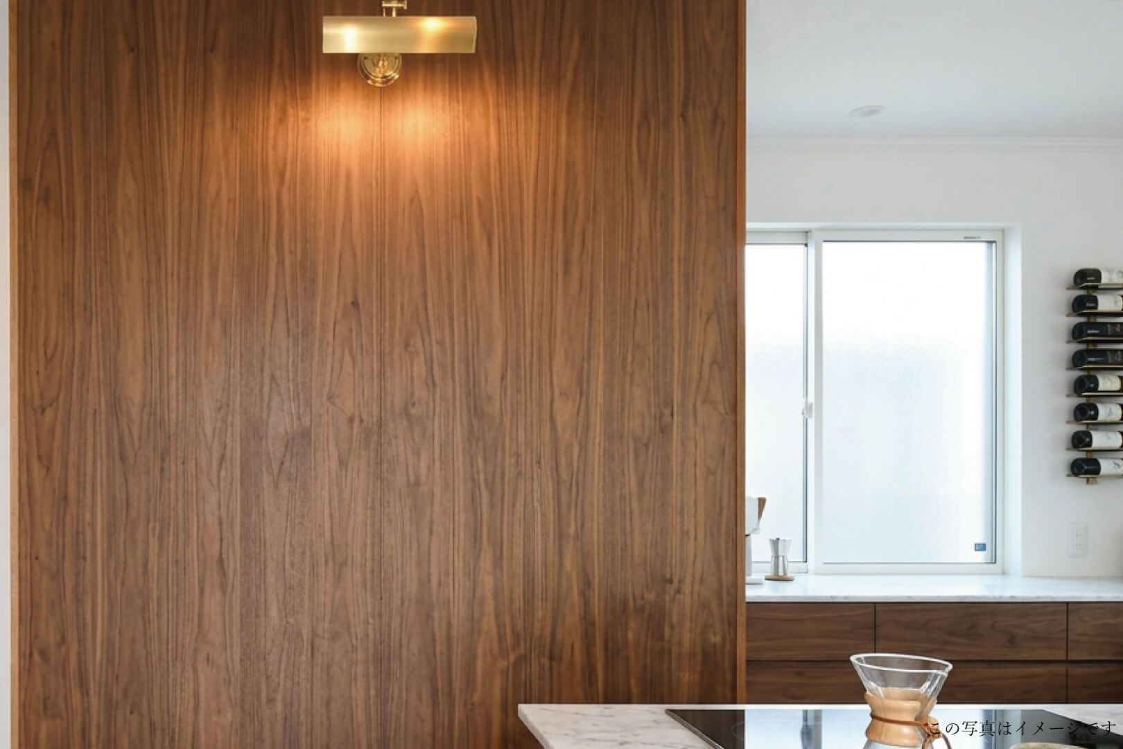 ・キッチン背面の壁は東濃檜のパネリングを貼っています